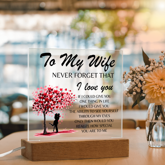 To My Wife Acrylic Plaque Lamp – “Never Forget That I Love You” Heart Tree Night Light (LED Wooden Base, Gift for Her)