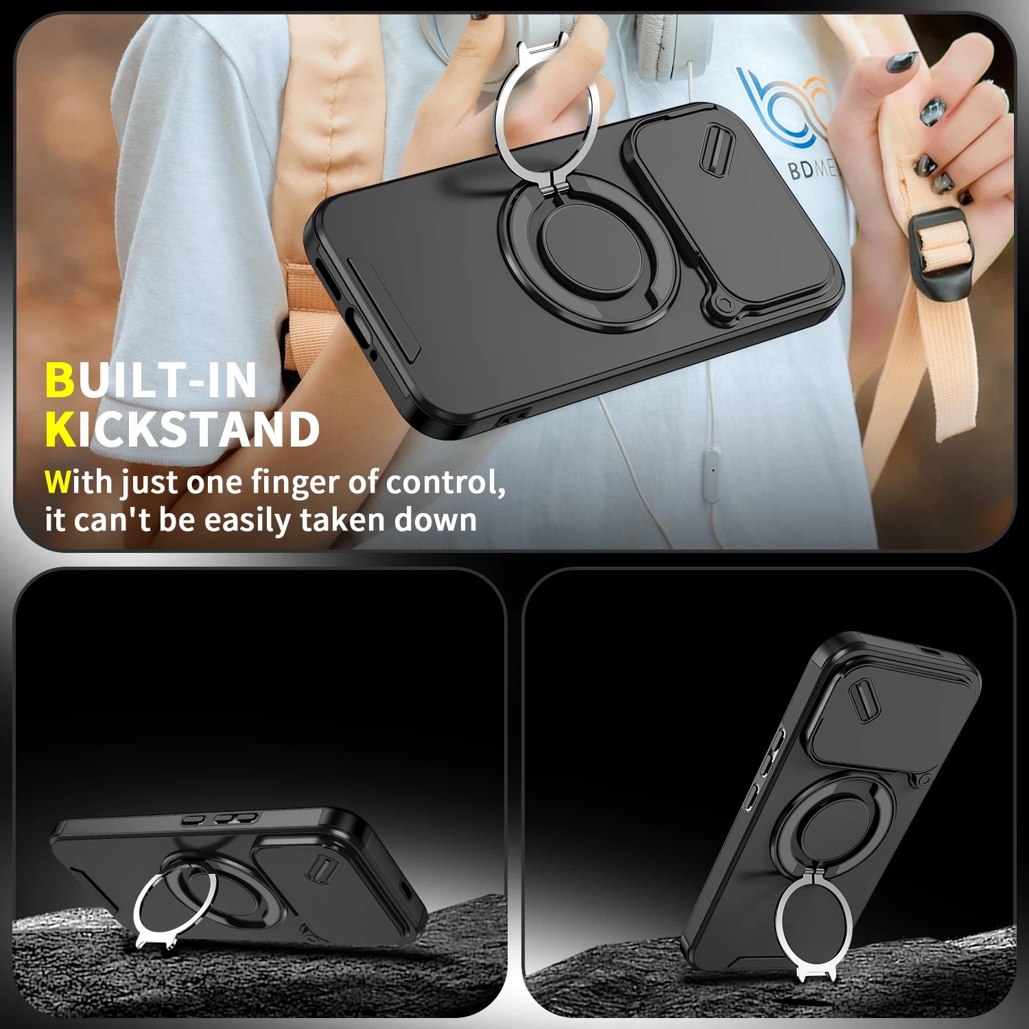 Combines shockproof TPU, hard PC back, sliding lens cover and metal ring for reliable daily protection and hands-free ease.