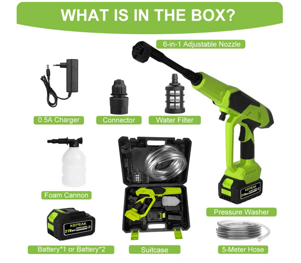 High-pressure water jet removes road grime and pollen quickly. Clean car exterior in minutes without scrubbing, saving time and effort on weekend chores.